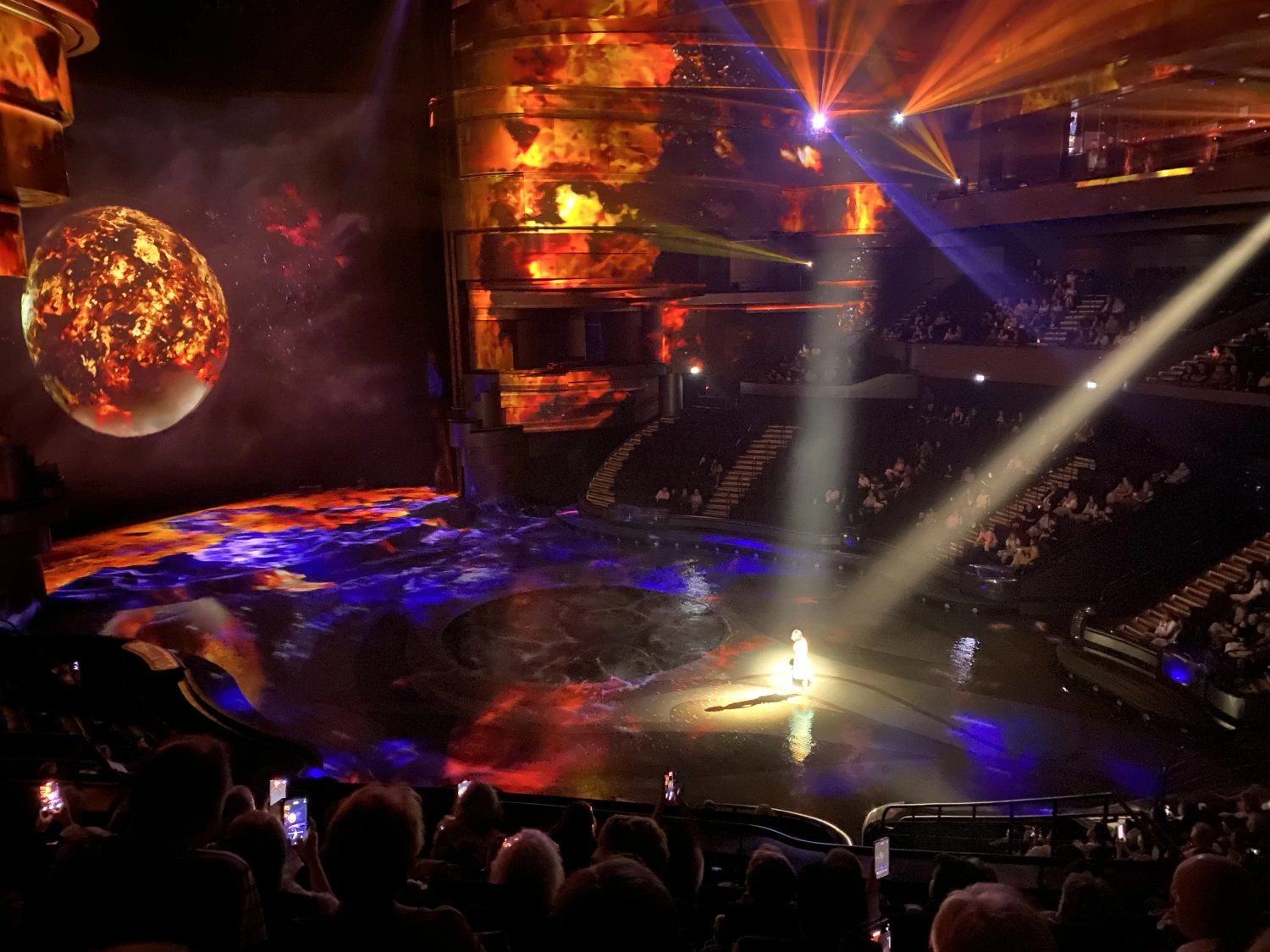 The audience area consists of 14 rows set at a 270-degree angle in a horseshoe shape surrounding the central stage — guaranteeing excellent views for all 1,300 guests. Screens are projected onto the walls, under the seats, and across the dome, while speakers built into the walls create immersive surround sound that literally brings the music and effects to life.